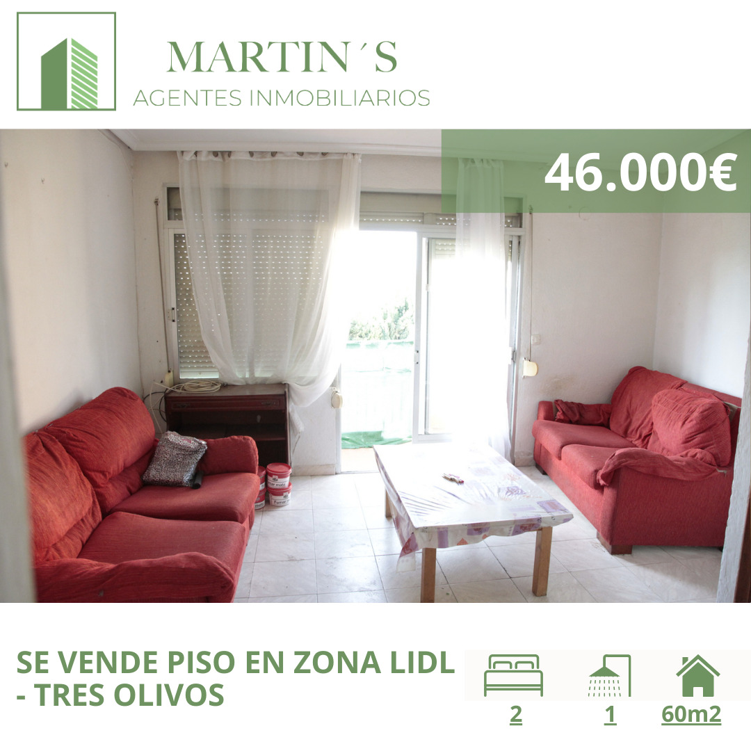 Se vende piso de 60m2 y muy luminoso en zona Tres Olivos – Lidl. La vivienda posee dos dormitorios, salón, baño independiente, terraza y cocina. La vivienda necesita un lavado de cara pero es totalmente habitable. Ideal como inversión.