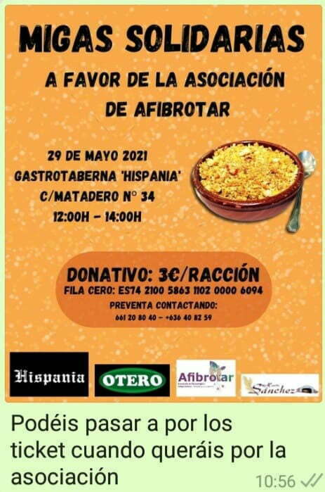 Info: La Asociación «Afibrotar» realiza unas migas solidarias en la Gastrotaberna «Hispania» situada en la calle Matadero nº34