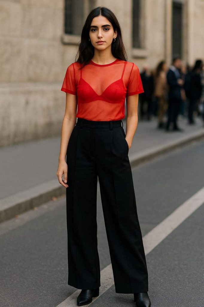 Rojo y negro es una combinación que nunca pasa de moda, pero este año regresa con más fuerza que nunca. Es dramática, sensual y poderosa. Piensa en looks monocromáticos donde uno de los colores sea el protagonista, como por ejemplo un total look en negro con un abrigo largo rojo o un top transparente con unos pantalones wide leg negros.