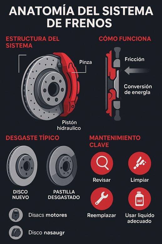 La infografía titulada “Anatomía del Sistema de Frenos” muestra de manera clara cómo funcionan los principales componentes del sistema de frenos de un vehículo. Presenta cuatro secciones: la estructura del sistema (disco, pinza y pistón hidráulico), cómo funciona (la fricción y conversión de energía para detener el coche), el desgaste típico (comparación entre discos nuevos y pastillas gastadas) y el mantenimiento clave (revisar, limpiar, reemplazar y usar el líquido adecuado).