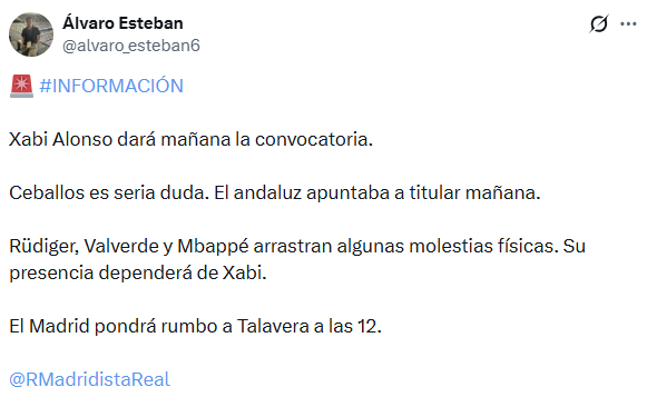 La noticia de ayer era correcta y confirmada por fuentes cercanas al Real Madrid y autoridades de Talavera. Finalmente decidieron no venir por seguridad. Desde Cover reafirmamos nuestro compromiso con una información próxima, actualizada y rigurosa. Entendemos que los planes de grandes clubes como el Real Madrid pueden estar sujetos a cambios operativos de última hora, y agradecemos la confianza de nuestros lectores.