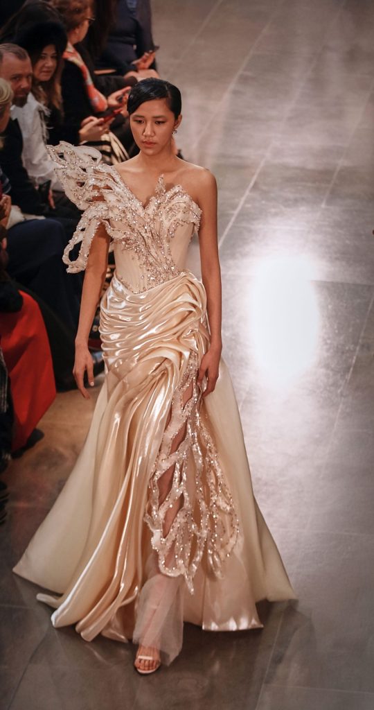 Más que un simple desfile, la presentación se desarrolló como una narrativa artística que explora la resiliencia femenina, la identidad y la transformación. Ajaj presentó 27 vestidos de alta costura que fusionan la elegancia oriental con la confianza contemporánea, ofreciendo una historia visual del tránsito de la mujer desde la sombra hacia la luz sin renunciar a la delicadeza ni al romanticismo.